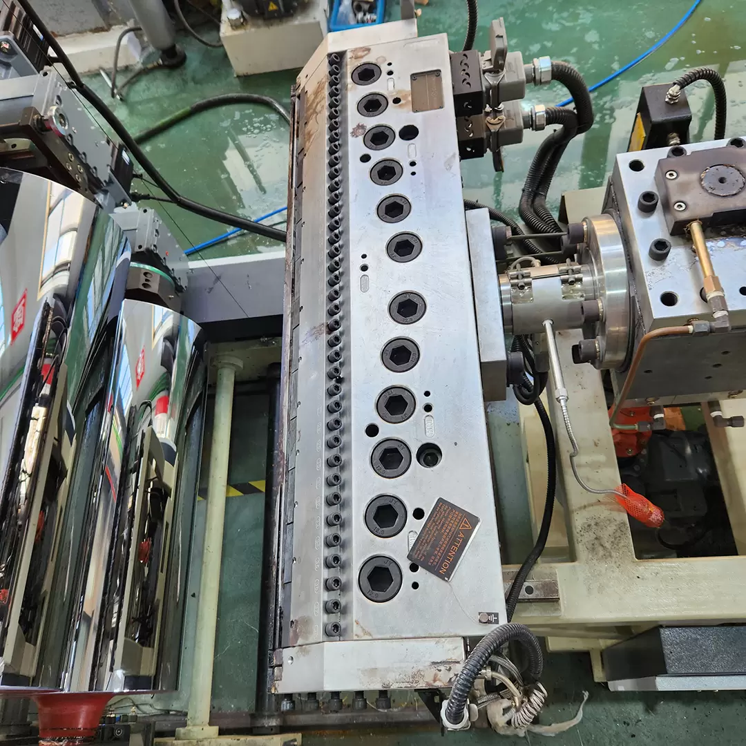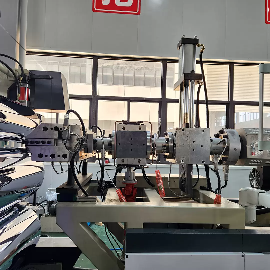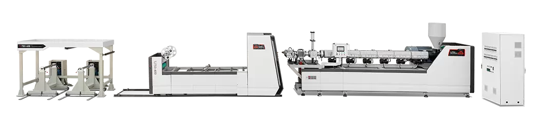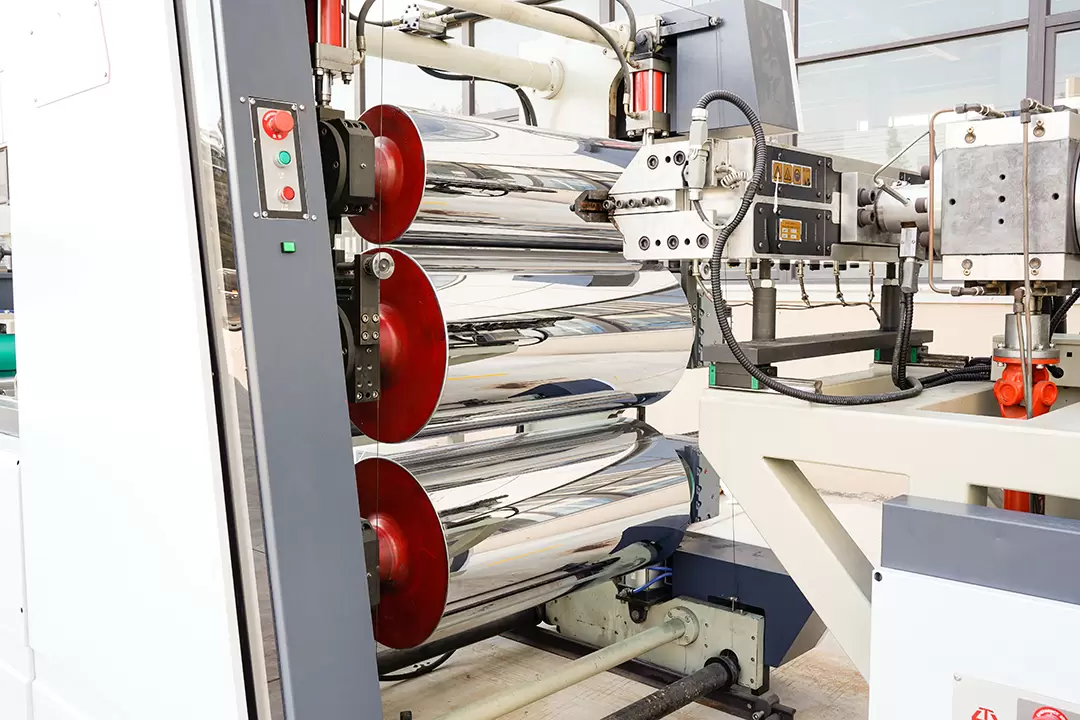 A extrusora de chapas é composta por extrusão, calandragem, tração, bobinagem e outras peças. As principais peças de desgaste passaram por um tratamento especial de alta qualidade e são resistentes à corrosão e a altas temperaturas. As forças de baixa resistência dentro do canal de extrusão da matriz garantem uma espessura uniforme da chapa, as ranhuras espirais nos três rolos garantem um resfriamento eficaz e a substituição da unidade hidráulica e a instalação do trocador de tela são fáceis sem parar a máquina.