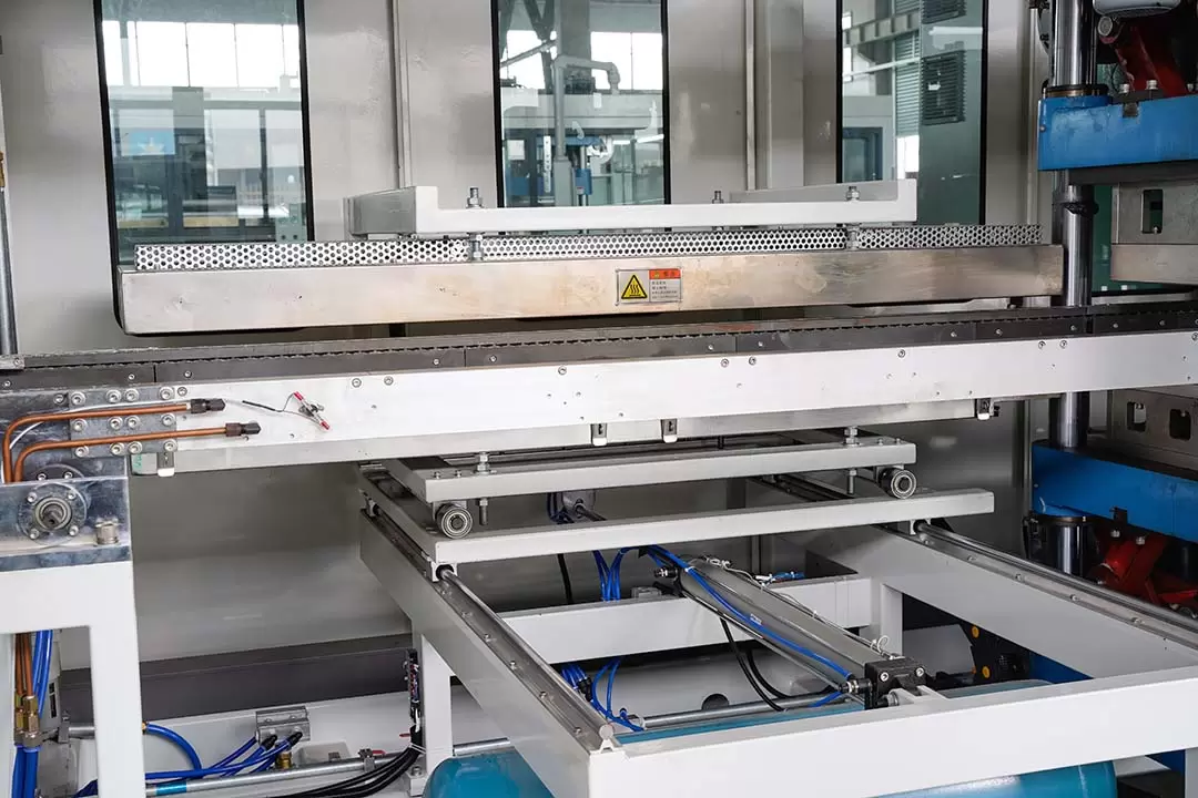 Estação de aquecimento: O sistema de aquecimento eficiente usa tecnologia de aquecimento infravermelho para aquecer uniformemente a folha de plástico, garantindo que o material seja aquecido uniformemente para atingir a temperatura ideal de moldagem.