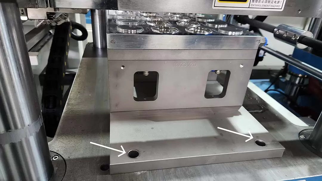 Estação de puncionamento: A prensa aciona o punção para pressionar rapidamente e fazer furos no produto plástico através da matriz de puncionamento.