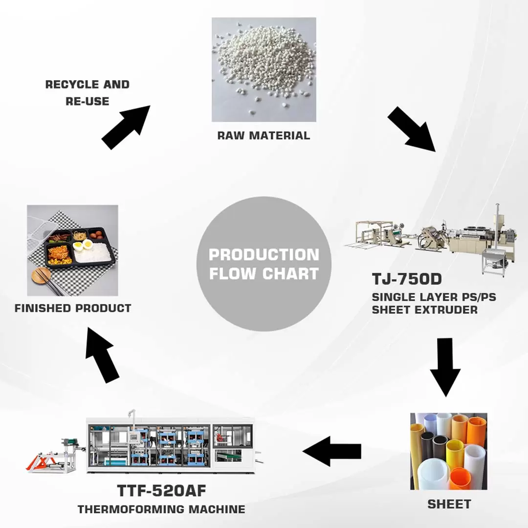 Os resíduos de chapas gerados pela máquina de termoformagem de plástico durante o processo de produção podem ser reciclados. Ao reciclar os resíduos, a poluição causada por resíduos plásticos no meio ambiente é reduzida, assim como o impacto ambiental causado por aterros sanitários e incineração de resíduos plásticos.