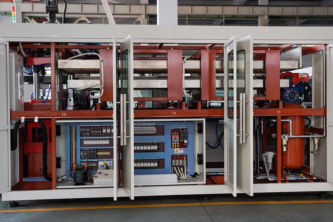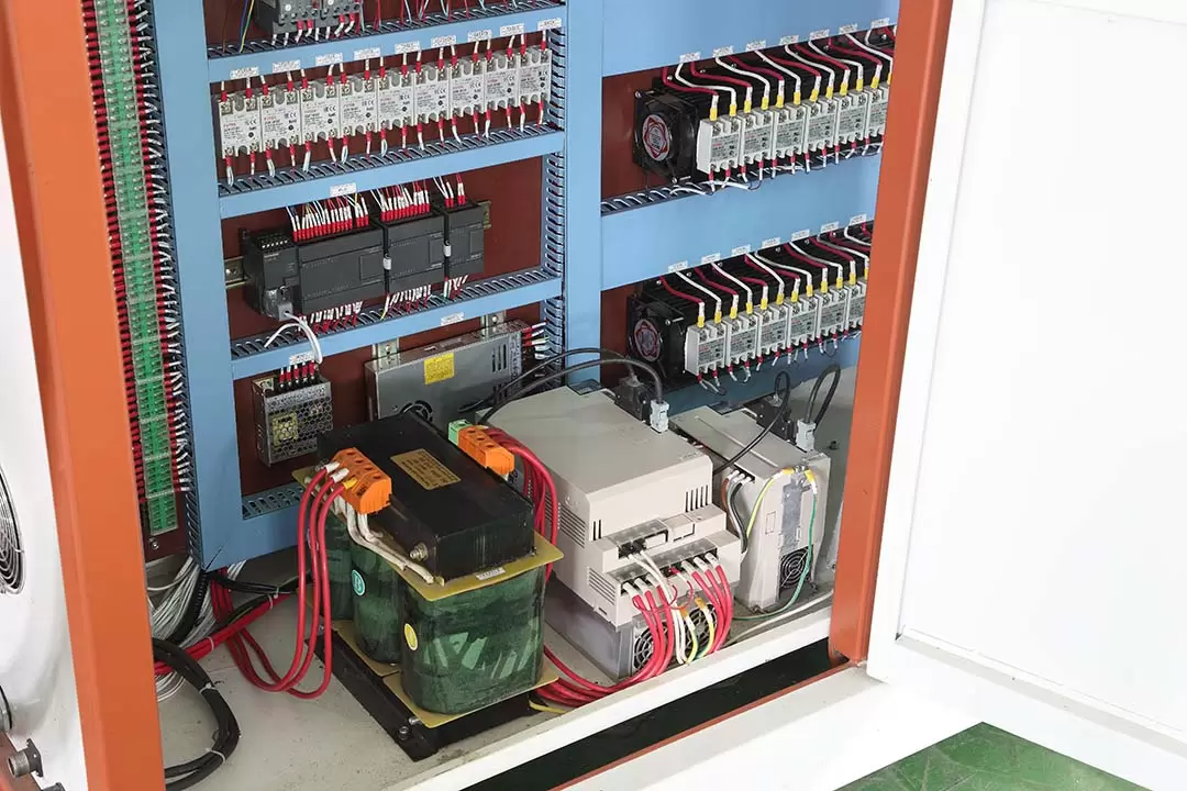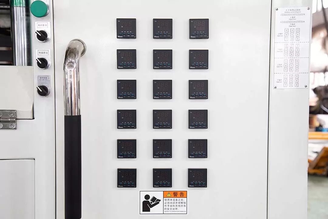 Sistema de controle de temperatura: usando um controlador programável PLC avançado, ele pode ajustar e monitorar com precisão a temperatura de aquecimento para garantir o aquecimento uniforme de folhas de plástico, garantindo assim a qualidade estável dos produtos acabados.