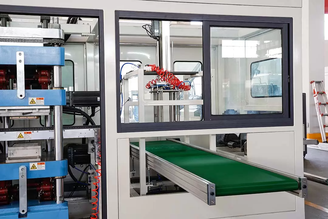 Design de três estações: O equipamento é equipado com três estações de trabalho: conformação, corte e empilhamento. As três estações trabalham simultaneamente, o que reduz significativamente o tempo de conformação de cada produto e proporciona uma produção contínua em alta velocidade.