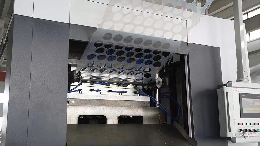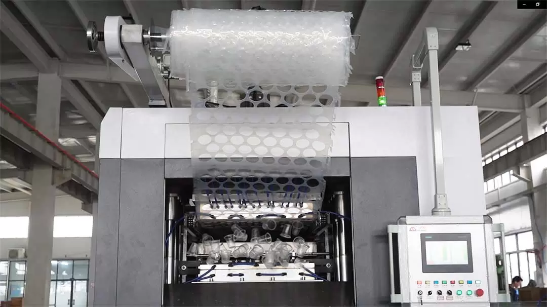 Corte: Os copos plásticos formados são separados das folhas excedentes pelo dispositivo de corte para obter copos acabados.
